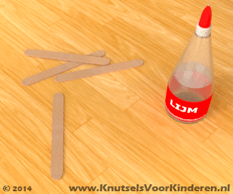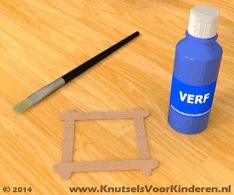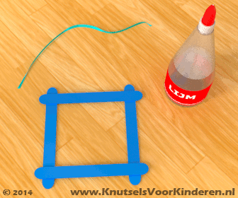 Maak een vierkant van ijsstokjes door twee stokjes naast elkaar te leggen en er dan twee bovenop te plaatsen. Lijm de ijsstokjes aan elkaar vast. Je kunt speciale houtlijm gebruiken, maar gewone alleslijm is ook goed genoeg.