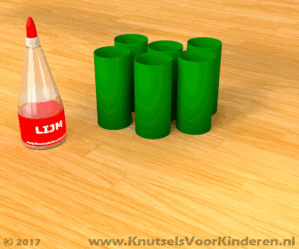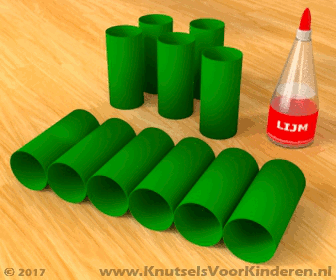 Als de verf droog is, pak 6 groene wc rollen. Leg een rol plat neer. Neem een tweede wc rol en maak een rechte strook lijm op de rol van links naar rechts. Duw de tweede wc rol met lijm tegen de eerste rol. Lijm net zo de andere 4 wc rollen tegen elkaar aan zodat je een rij van 6 rollen krijgt.