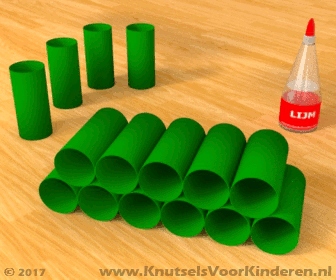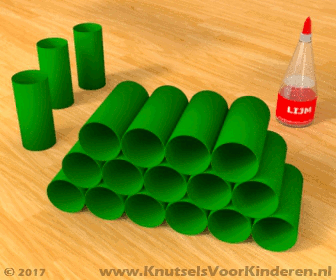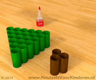 Pak 4 groene wc rollen voor de derde rij. Maak twee stroken lijm op een wc rol en leg deze precies tussen twee rollen van de tweede rij. Lijm net zo de andere 3 wc rollen om de derde rij af te maken.
