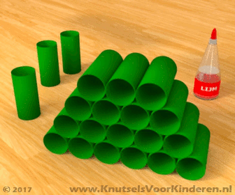 Doe lijm bovenop de 3 bruine rollen en zet voorzichtig de driehoek van groene wc rollen erbovenop.