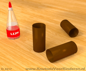 Pak de 3 bruine wc rollen en zet ze rechtop. Neem een wc rol en maak een rechte strook lijm van boven tot onder. Duw een tweede wc rol tegen de rol met lijm. Wacht even tot de lijm droog is en lijm dan de derde rol precies in het midden van de eerste twee rollen, net zoals we de groene rollen op elkaar hebben gelijmd.