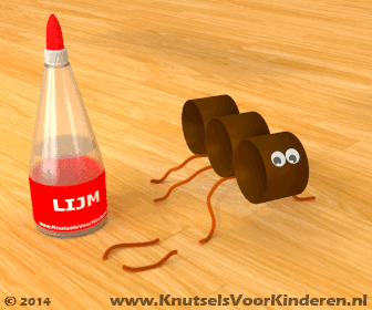 Zet de mier voorzichtig op zijn pootjes en buig de pootjes zodat hij kan staan. Plak 2 korte stukjes pijperager op het voorste stukje wc rol.