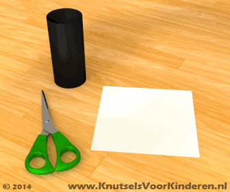 Pak een stukje wit papier en knip er een rechthoek uit dat ongeveer zo hoog is als een halve wc rol. Rond de hoeken bovenaan mooi af.
