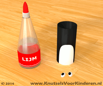 Plak 2 oogjes op de wc rol boven het witte stuk papier. Dit kunnen kant-en-klare oogjes zijn, of je kunt ze zelf maken van het witte en zwarte papier.