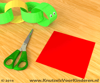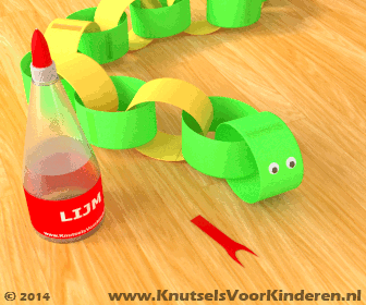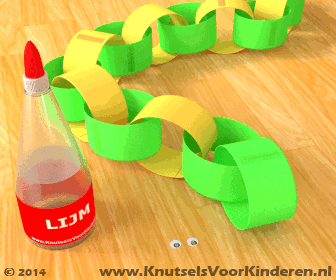 Doe hetzelfde met een andere kleur papier. Voor onze slang hebben we 9 groene strookjes en 8 gele strookjes gebruikt.