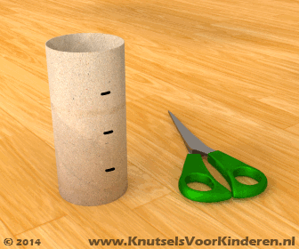 Teken met een stift of pen een streepje ongeveer in het midden van de wc rol. Teken daarna nog twee streepjes op een kwart en driekwart hoogte om de wc rol in 4 ongeveer gelijke stukjes op te delen.