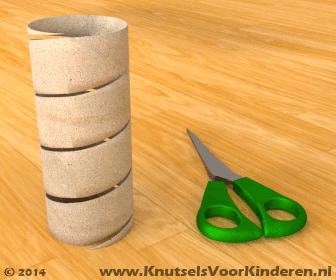 Knip de wc rol nu in een spiraal open van onderen naar boven. Begin midden onder de streepjes met schuin omhoog knippen. Knip niet te schuin omhoog, maar zorg dat je na één rondje bij het eerste streepje uitkomt. Knip zo verder en probeer door alle streepjes te knippen met omhoog gaan.