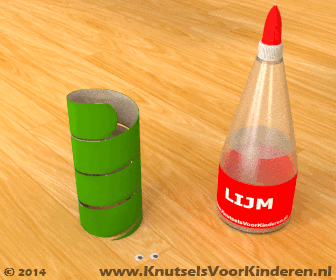 Als de verf droog is, plak twee oogjes bovenaan op de wc rol. Dit kunnen kant-en-klare oogjes zijn, of je kunt ze zelf maken met bijvoorbeeld wit en zwart papier.