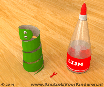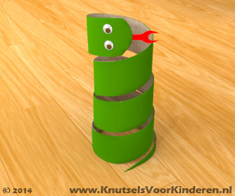 De slang is af. Je kunt de wc rol iets verbuigen om de slang wat breder of platter te maken, en je kunt de slang nog versieren met stiften of glitters.