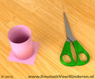 Pak een stuk roze papier van ongeveer 6 x 15 cm. Doe lijm langs een korte rand van het papier, pak het papier op en breng de uiteinden naar elkaar toe zodat je een cirkel krijgt ongeveer zo groot als een wc rol. Plak de uiteinden netjes op elkaar.