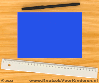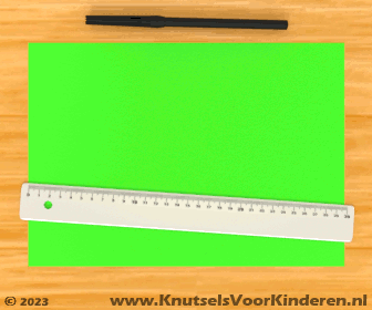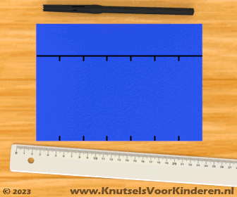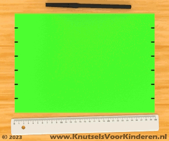 Pak een tweede vel A4 papier of karton in een andere mooie kleur. Leg een liniaal langs beide korte zijdes en zet een streepje bij 3, 6, 9, 12, 15 en 18 cm.
