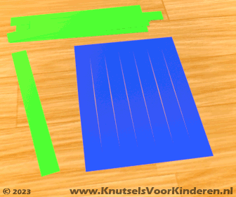 Doe nu hetzelfde met alle andere strookjes, begin elke keer om en om boven/onder aan de linkerzijde van het grote vel. Mocht je het laatste strookje er niet doorheen krijgen, dan kun je de 6 gleuven in het vel iets verder open knippen.
