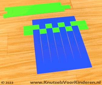 Nu kan het vlechten beginnen. Pak één van de zeven strookjes en leg deze dwars ten opzichte van het vel met de 6 gleuven. Begin aan de linkerzijde en haal het strookje door elke gleuf zodat het om en om onder en boven de banen van het grote vel ligt. Duw het strookje dan zo ver mogelijk naar de zijkant.