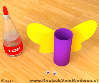 Als de verf droog is, plak dan de vleugels op de wc rol.