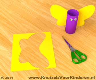Pak een stukje mooi gekleurd papier en knip er vleugels uit voor de vlinder. Het is makkelijk eerst met potlood op het papier te tekenen hoe de vleugels ongeveer moeten worden. Je kunt de wc rol op het papier leggen om te meten.